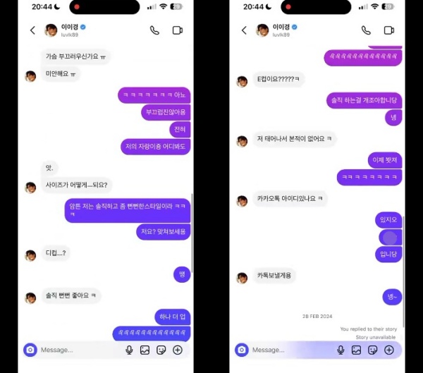 A¾¾ ¶ÇÇÑ °ÅºÎ°¨À» µå·¯³»Áø ¾Ê¾Ò´Ù. "ºÎ²ô·´Áø ¾Ê´Ù" "ÀúÀÇ ÀÚ¶ûÀÌ´Ù" "¼ÖÁ÷ÇÑ °É ÁÁ¾ÆÇÑ´Ù"¸ç ´äÀåÀ» °è¼ÓÇß´Ù. ÀÌÀ̰æÀº "īī¿ÀÅå ¾ÆÀ̵ð ÀÖ³Ä"°í Áú¹®Çß°í, A¾¾°¡ ¾ÆÀ̵𸦠¾Ë·ÁÁÖÀÚ "Ä«Åå º¸³»°Ú´Ù"°í ¸»Çß´Ù. ÇØ´ç ¸Þ½ÃÁö¸¦ ¸¶Áö¸·À¸·Î µÎ »ç¶÷ÀÇ DMÀº ÁߴܵƴÙ. ÀÌÈķδ īī¿ÀÅåÀ» ÅëÇØ ¼ÒÅëÇÑ °ÍÀ¸·Î ÃßÁ¤µÈ´Ù.
