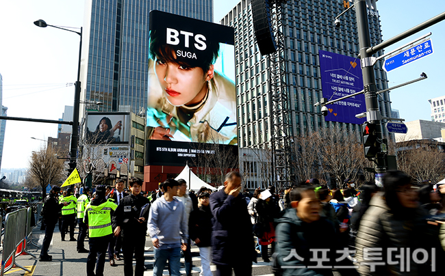 [½ºÆ÷Ã÷Åõµ¥ÀÌ ÆØÇöÁØ ±âÀÚ] ±º¹é±â¸¦ ¸¶Ä¡°í 3³â 9°³¿ù ¸¸¿¡ ¿ÏÀüü·Î µ¹¾Æ¿Â ¹æÅº¼Ò³â´Ü(BTS)ÀÇ 5Áý '¾Æ¸®¶û'(ARIRANG) ÄÄ¹é °ø¿¬ÀÌ 21ÀÏ Àú³á 8½Ã ¼¿ï ±¤È¹®¿¡¼ ¿¹Á¤µÈ °¡¿îµ¥ À̸¥ ½Ã°£ºÎÅÍ ¸ðÀÎ BTS ÆÒµé·Î ±¤È¹® ÀÏ´ë°¡ ºÏÀûÀ̰í ÀÖ´Ù. 2026.03.21.