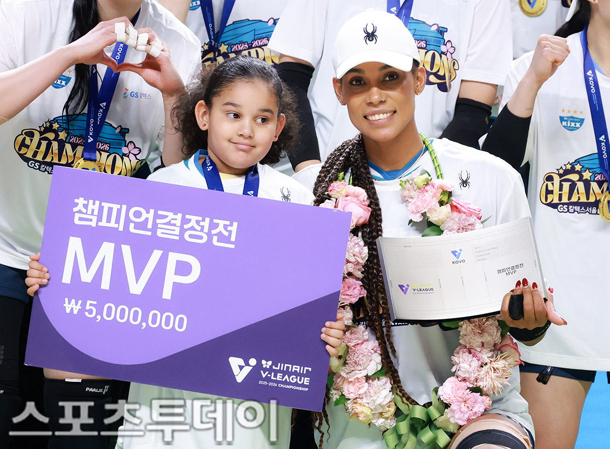 À̳¯ GSĮŨ½º°¡ ¼¼Æ®½ºÄÚ¾î 3-1(25-15 19-25 25-20 25-20)·Î èÇǾð°áÁ¤Àü ¿ì½ÂÀ» Â÷ÁöÇß´Ù. MVP¸¦ Â÷ÁöÇÑ ½Ç¹Ù°¡ µþ ½Ã¾Æ³ª¿Í ÇÔ²² ±â³ä»çÁøÀ» ÃÔ¿µÇϰí ÀÖ´Ù.2026.04.05.
